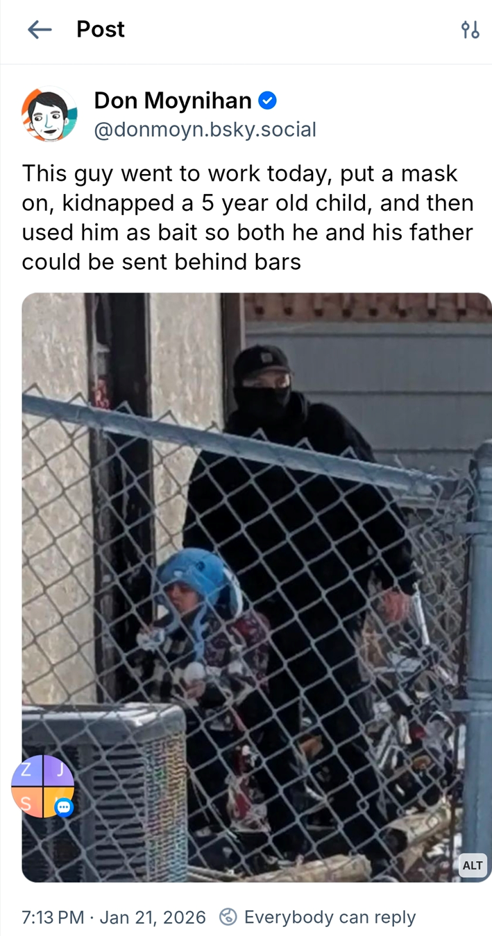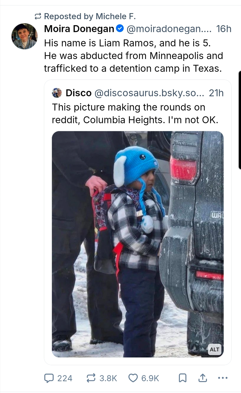 Billions are going to masked paramilitary thugs who shoot, beat up, gas, and seize US citizens. Your silence makes you complicit. Immigrants who entered this country legally are being seized with their children. Our nation is putting children into cages. You are complicit. Below is Liam Ramos. He was grabbed and used to gain entry to the house. He was taken to a for profit concentration camp in Texas. You are complicit. Your President talks about no mid-term elections, and you remain silent. A DOGE employee sells our social security information to a group of election deniers. You are complicit.